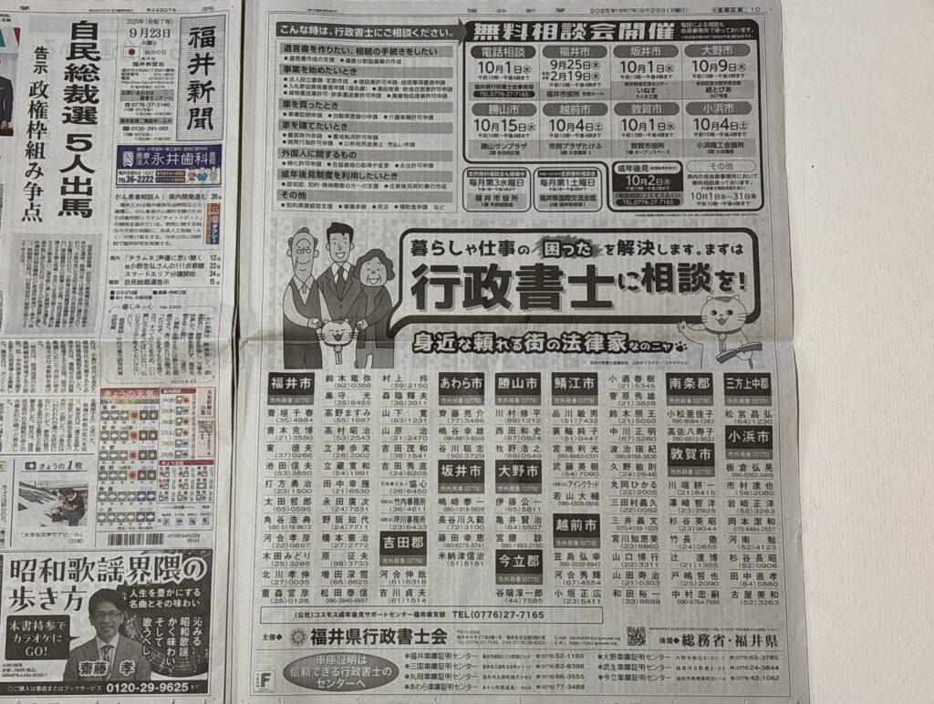 その一環として、本日(9月23日)の福井新聞に広告と当職が掲載されました。